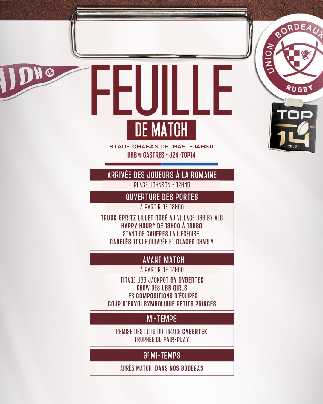 Ce samedi c’est le retour du TOP 14 à Chaban avec un choc face au Castres Olympique pour la 24e journée de TOP 14 ! Avant-match, buvettes, boutiques... retrouvez toutes les infos à connaître sur la rencontre dans notre article :
