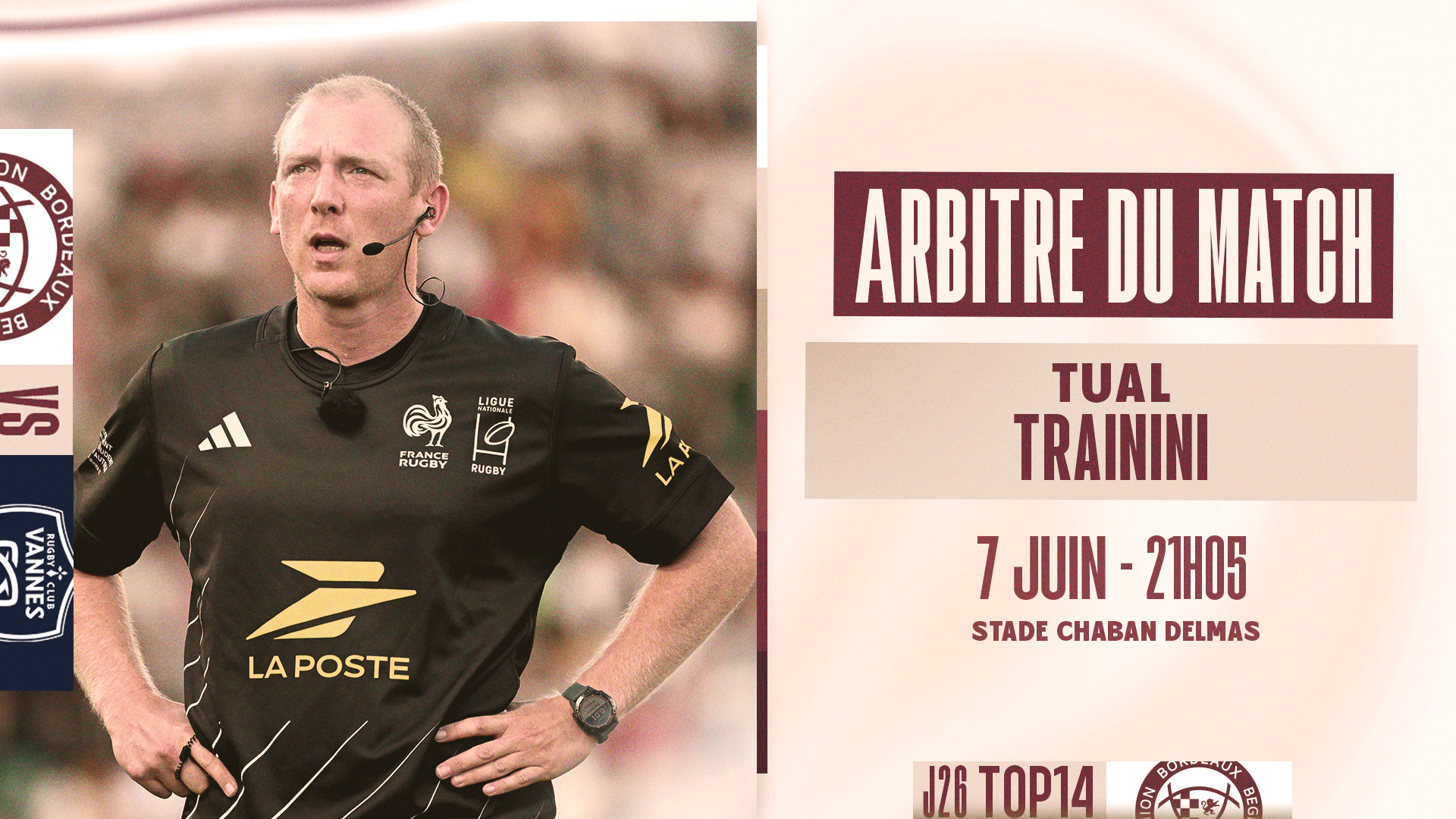 Nos joueurs disputent la 26e et dernière journée de championnat de Top 14, ce samedi 7 juin à 21h05 à Chaban face aux bretons du RC Vannes. Voici le corps arbitral pour cette rencontre :