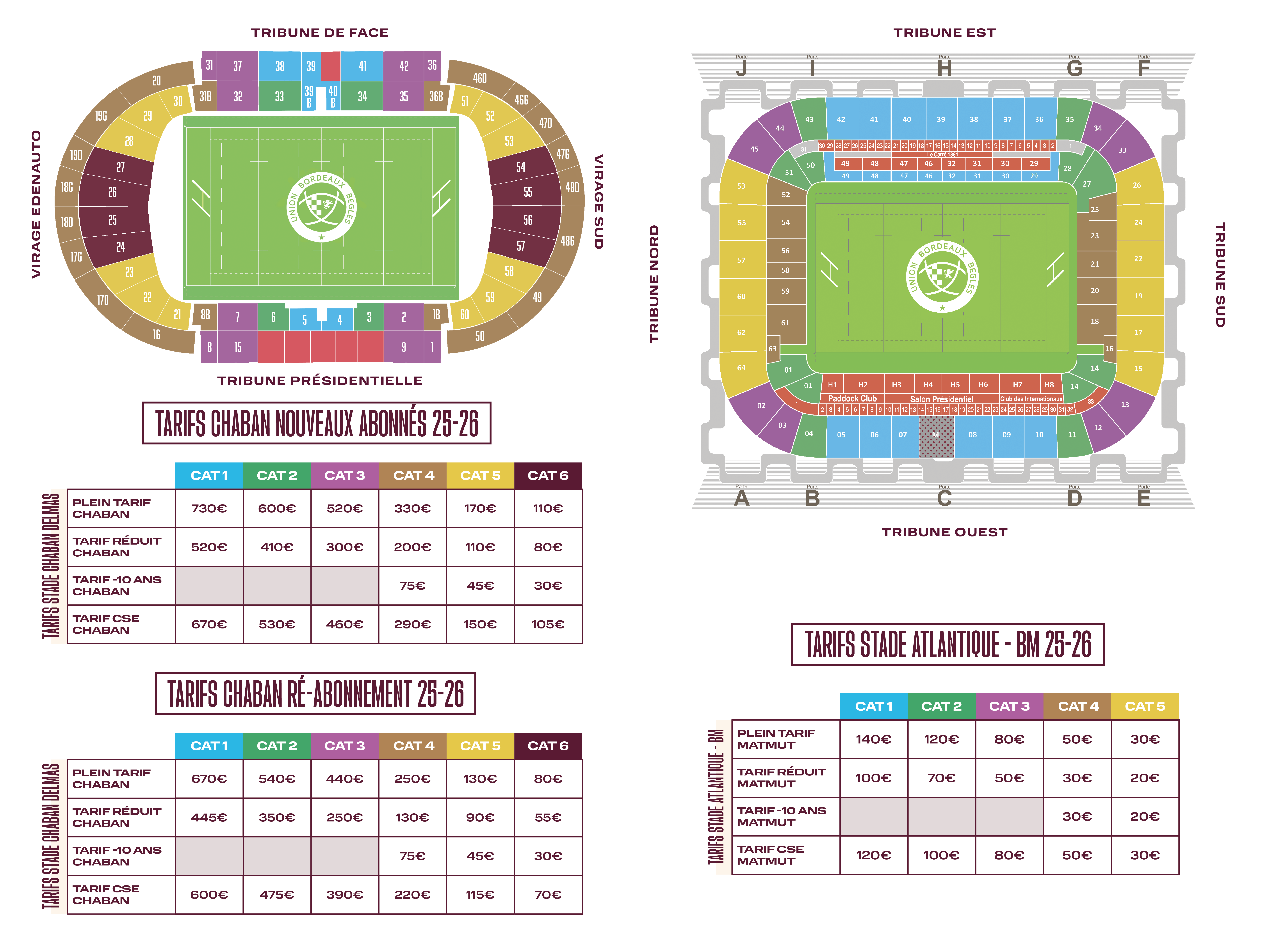Comme chaque année, nos abonnés de la saison 2024-2025 seront assurés de pouvoir conserver le même siège au stade Chaban Delmas pour la saison 2025-2026, jusqu'au 31 juillet inclus (la place au stade Atlantique n'est pas bloquée). Vous bénéficiez également d'un tarif préférentiel pour vous réabonner (voir tarifs ci-dessous). Attention, dès le 1er août le siège sera remis en vente au grand public.