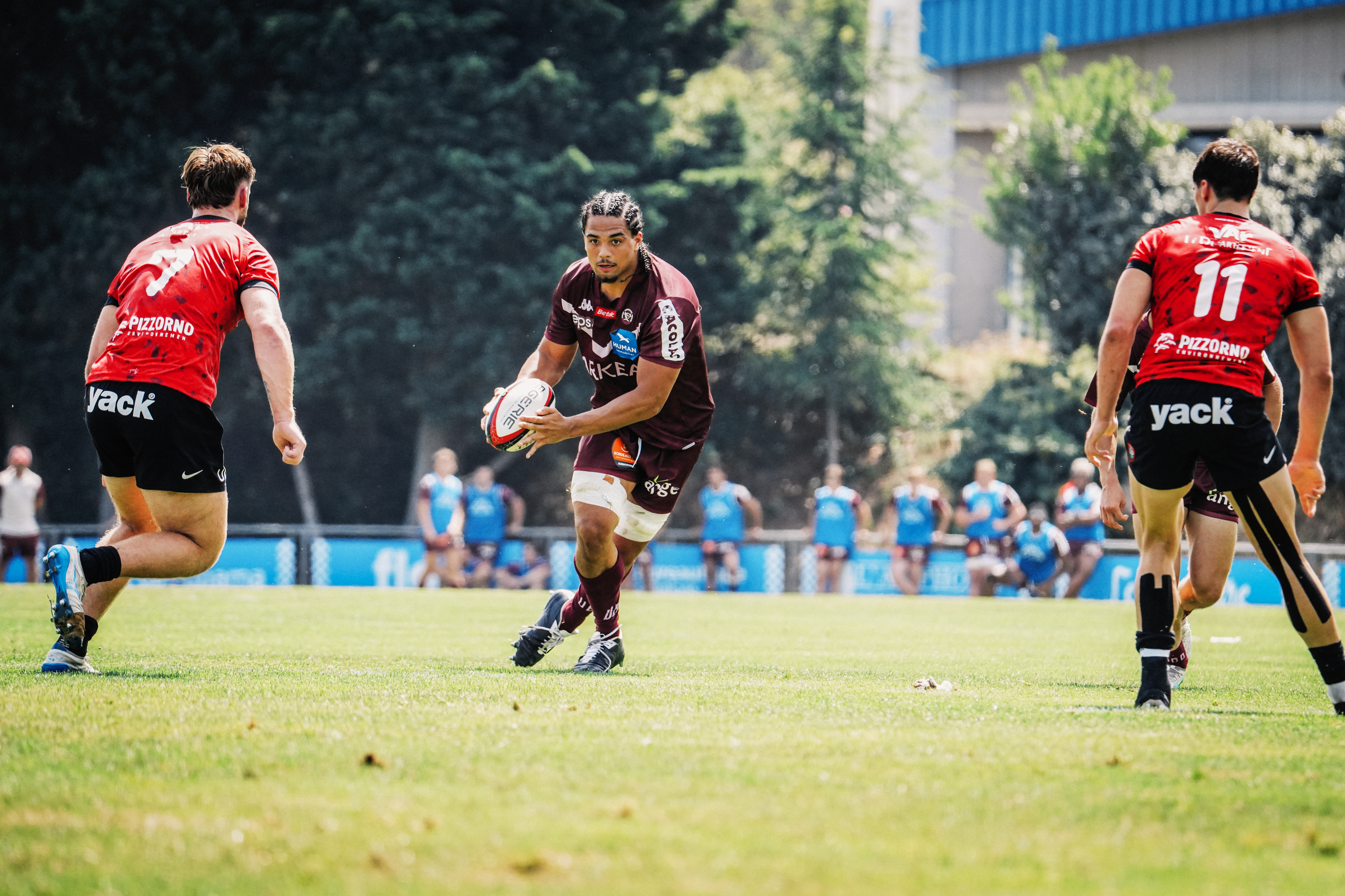 Nos girondins repartent ensuite à l'attaque mais s'heurtent à plusieurs reprises à la grosse défense des varois (28e , 30e, 34e). Ils finissent par concrétiser ce gros temps fort par une pénalité de leur demi de mêlée Warisse (36e) qui permet aux siens de mener d'une courte tête à la pause (10-9) dans la chaleur de Leucate.