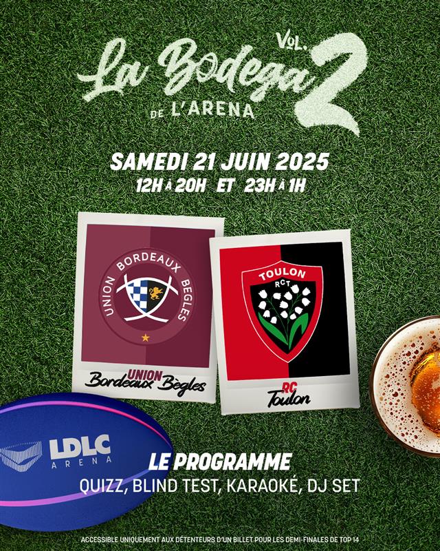 "Fidèles et fervents supporters de l’UBB, la LDLC Arena sort les grandes tablées et vous donne rendez-vous dans sa Bodega pour profiter des animations et prolonger la passion du rugby en avant et après-match de cette demi-finale de Top 14.