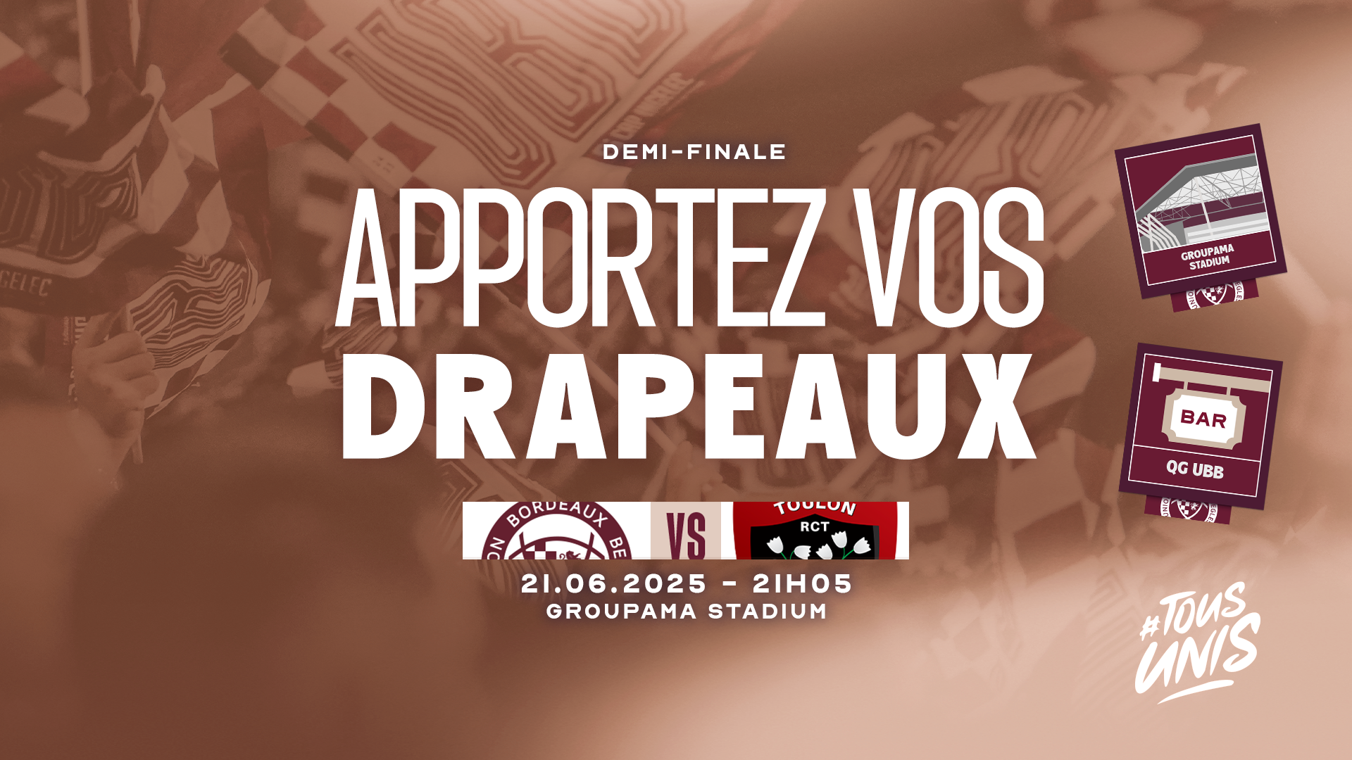 À l'approche de la demi-finale, portez et affichez les couleurs de nos Bordeaux & Blanc dès aujourd'hui pour soutenir votre équipe ! Et si vous avez la chance d'avoir un billet pour samedi, pensez à amener votre drapeau dans vos valises et au stade.