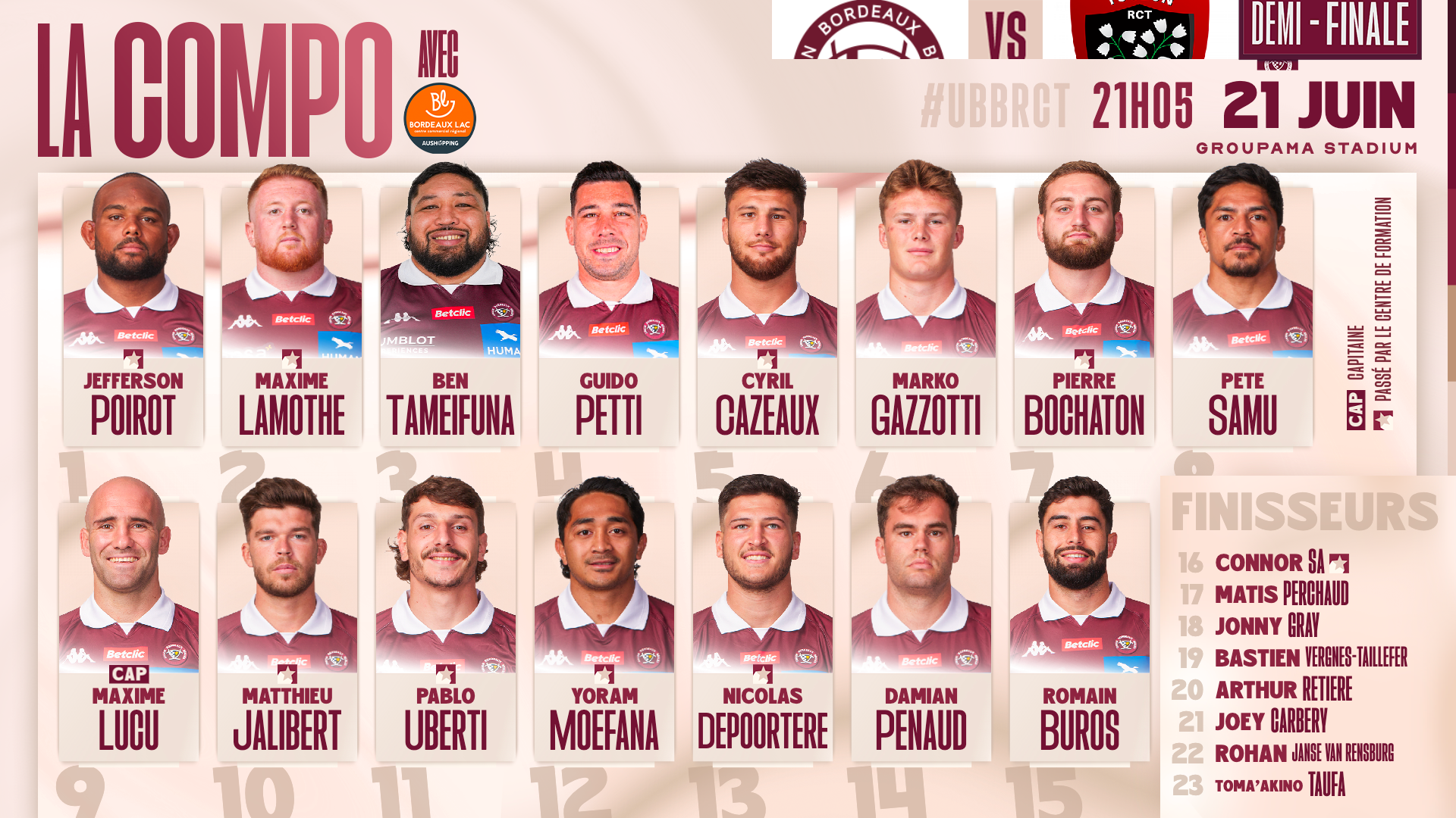 Le début de la phase finale de TOP 14 débutera demain soir à 21h05 face aux toulonnais, au Groupama Stadium de Lyon. À cet effet, découvrez la composition d'équipe de nos Bordeaux & Blanc :