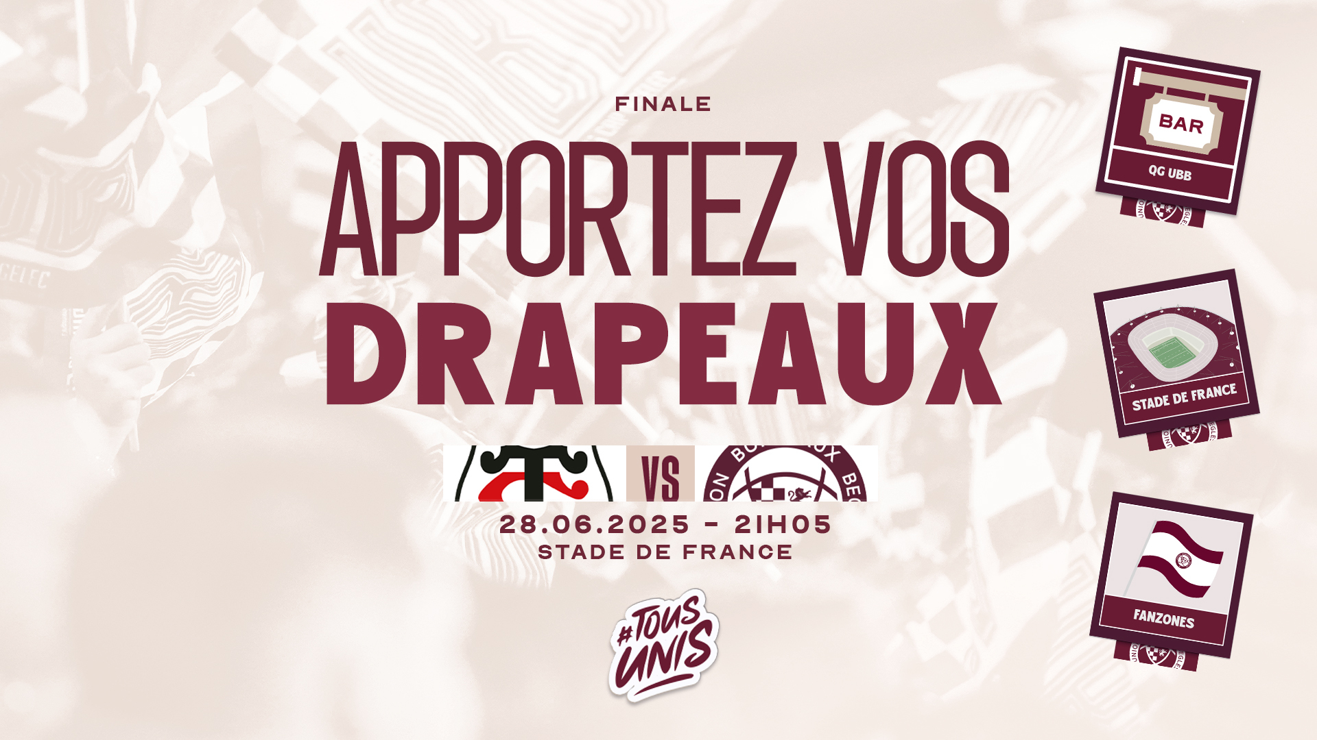 Nous vous invitons tous à venir à Paris avec vos drapeaux aux couleurs de l'UBB ! Pour les supporters ne pouvant pas faire le déplacement, nous vous proposons de vous retrouver du côté de nos bars partenaires "QG UBB" ou bien des Fan Zones Places des Quinconces et Stade Moga également avec vos drapeaux pour soutenir votre équipe !