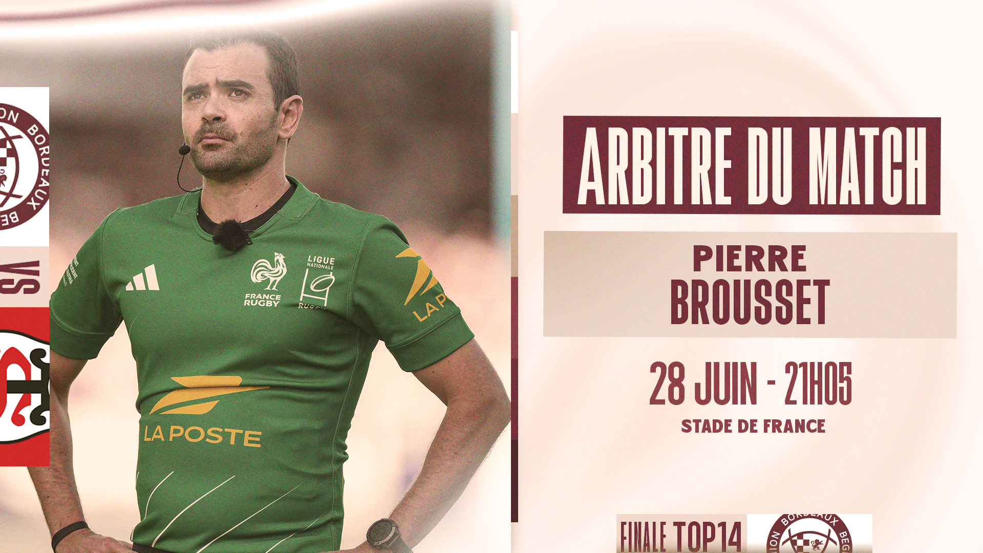 Pierre Brousset sera au sifflet de cette finale face à Toulouse. Il sera assisté de L. Ramos et L. Cayre sur les touches ainsi que de E. Gauzins à la vidéo.