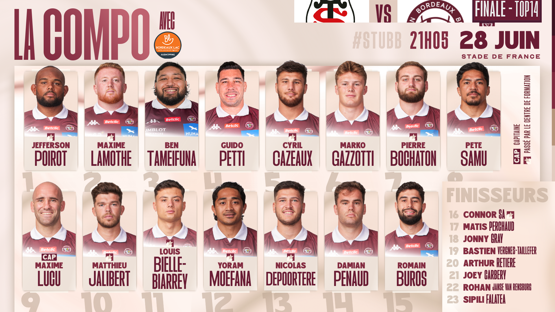 La grande finale du TOP 14 face au Stade Toulousain se jouera demain à 21h05. Yannick Bru et son staff vous dévoilent la composition :