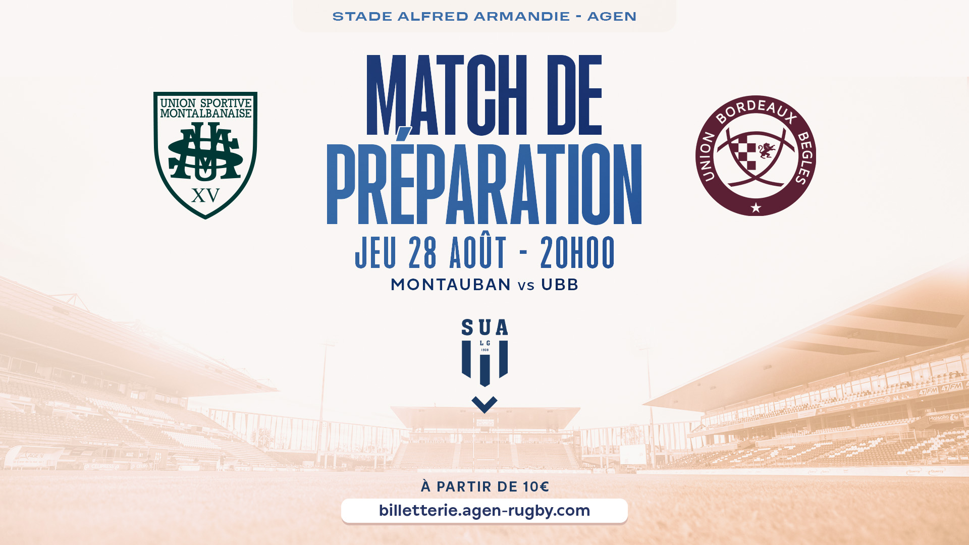 Dans le cadre des matchs de préparation pour la saison 2025-2026, l'UBB se rendra au stade Armandie, à Agen, pour y disputer sa seconde rencontre estivale face à Montauban. Coup d’envoi prévu le 28 août à 20h.