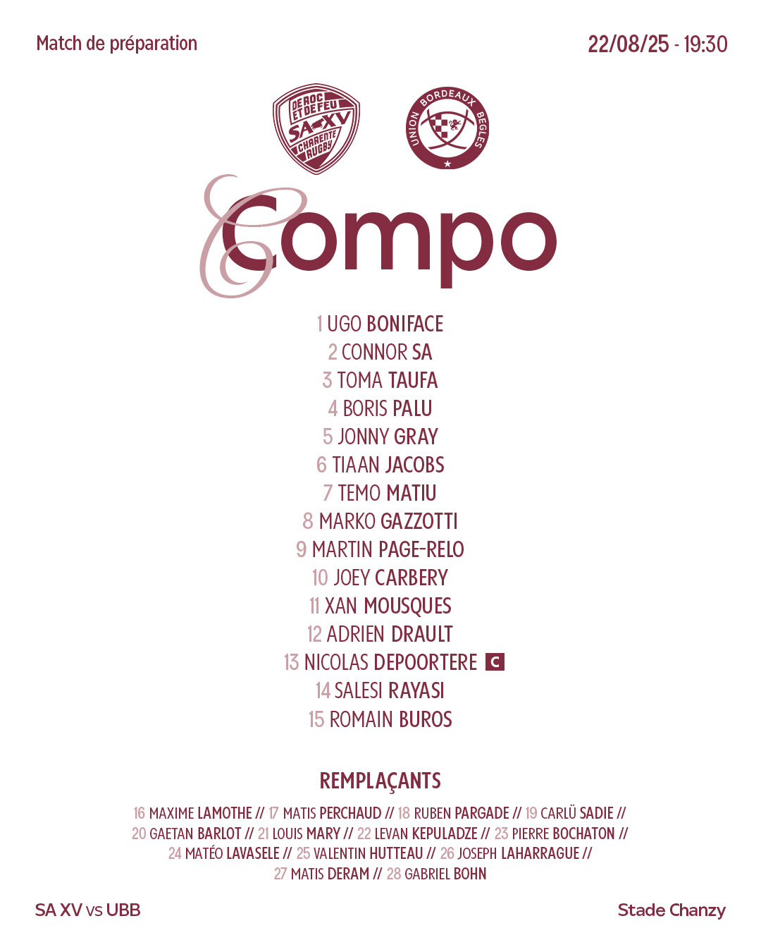 Découvrez la composition de notre équipe pour le premier match amical de la saison demain à 19h30 au stade Chanzy face au SA XV.
