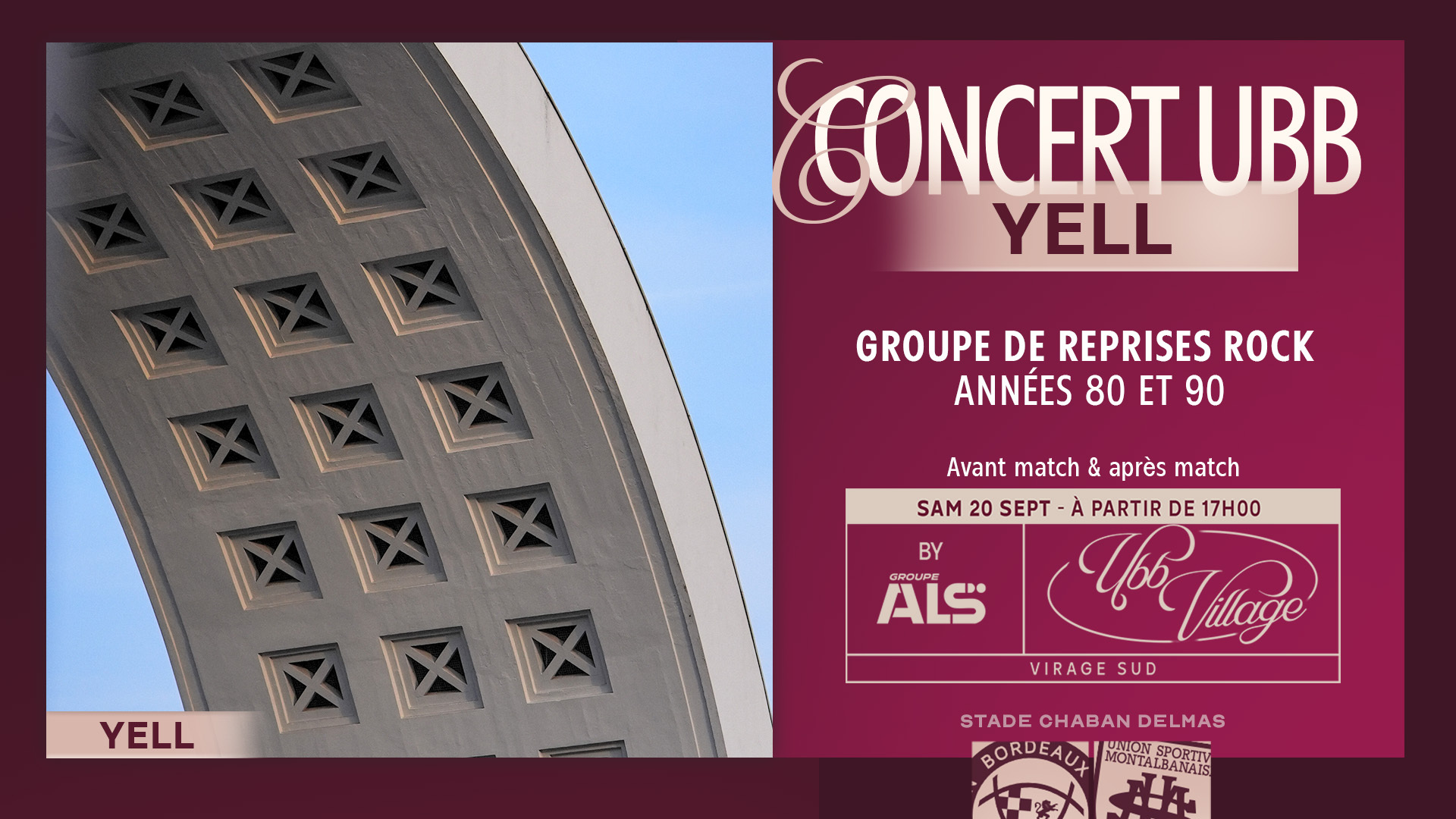 Pour cette rencontre l'UBB invite le groupe Yell au Village UBB by ALS qui vous proposera des reprises rock des années 80 et 90.