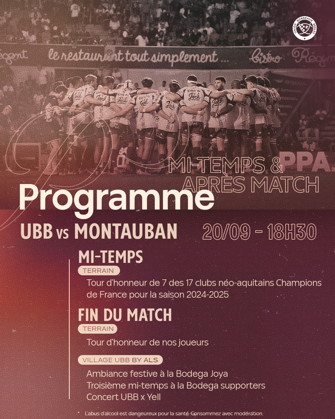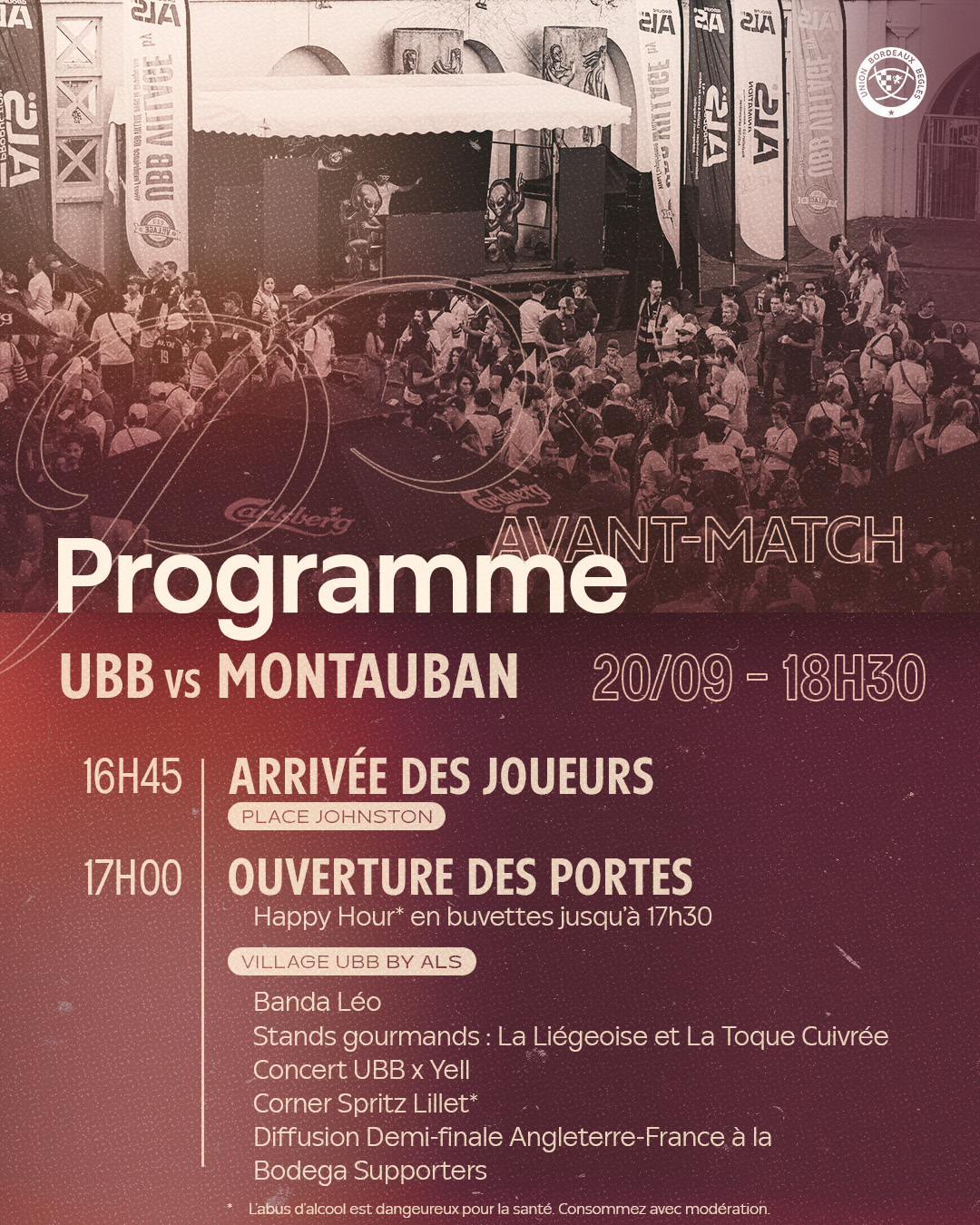 Le bus de l'UBB déposera les joueurs Place Johnston autour de 16h45, pour qu'ils parcourent les derniers mètres au plus proche de vous, avec speaker et DJ à partir de 16h30. Venez partager ce moment privilégié !