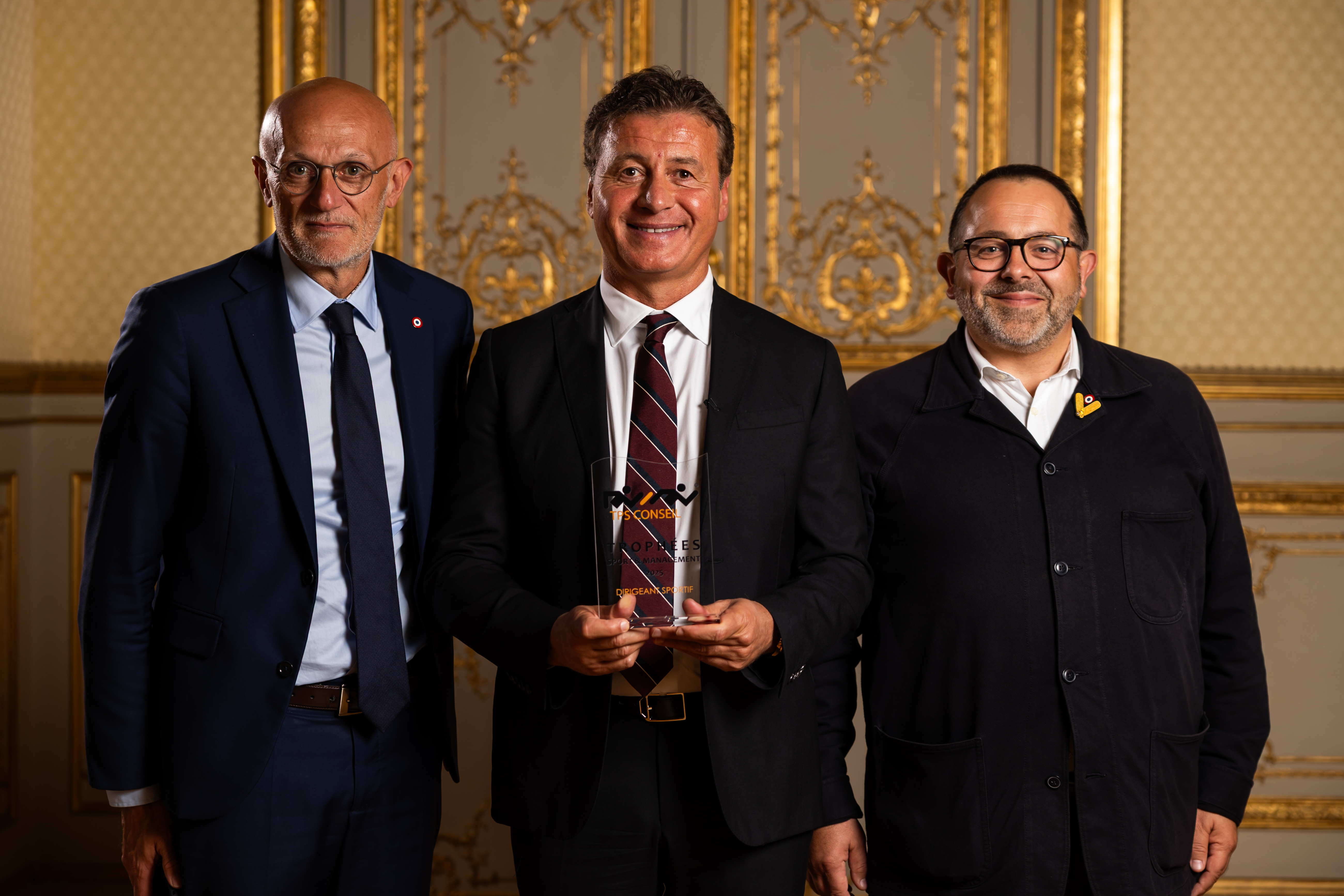 Laurent Marti entouré des députés Stéphane Mazars et François Cormier-Bouligeon qui lui ont remis le trophée. (@tps conseil)