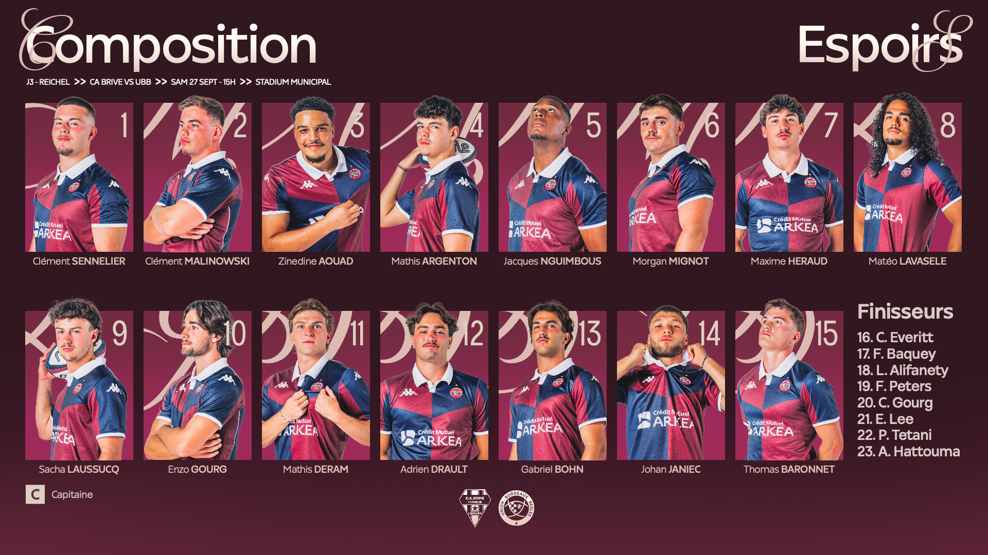 Ce samedi 27 septembre nos jeunes espoirs défieront les brivistes chez eux, à 15h pour la 3e journée du Championnat Reichel. Voici la composition d'équipe :