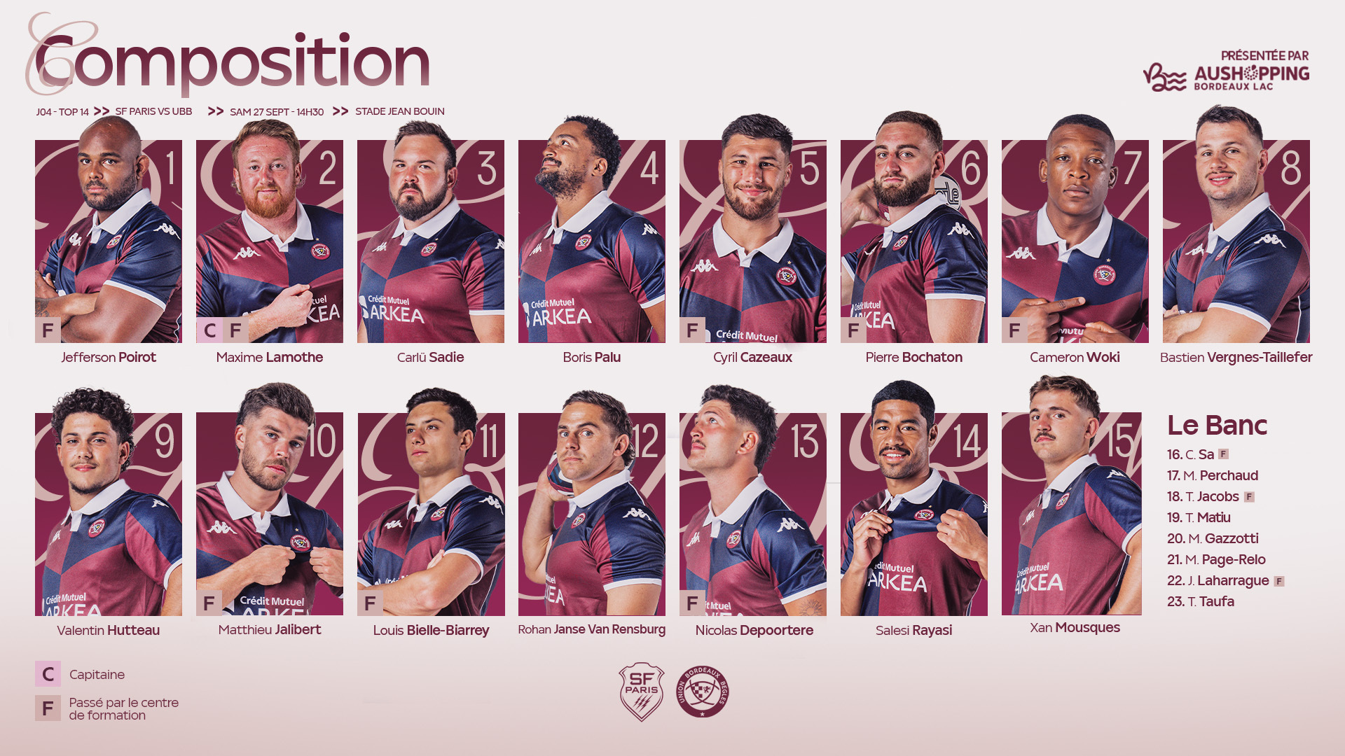 Pour leur second déplacement de la saison, nos Girondins retournent dans la capitale pour défier le Stade Français Paris à Jean-Bouin. Le coup d'envoi face aux Soldats Roses sera donné à 14h30 ce samedi 27 septembre. Voici la composition :