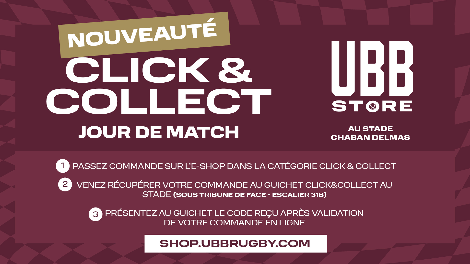 📍 Point de retrait Click & Collect – Stade Chaban Delmas, sous la tribune de face, entre les escaliers 31B et 30.
