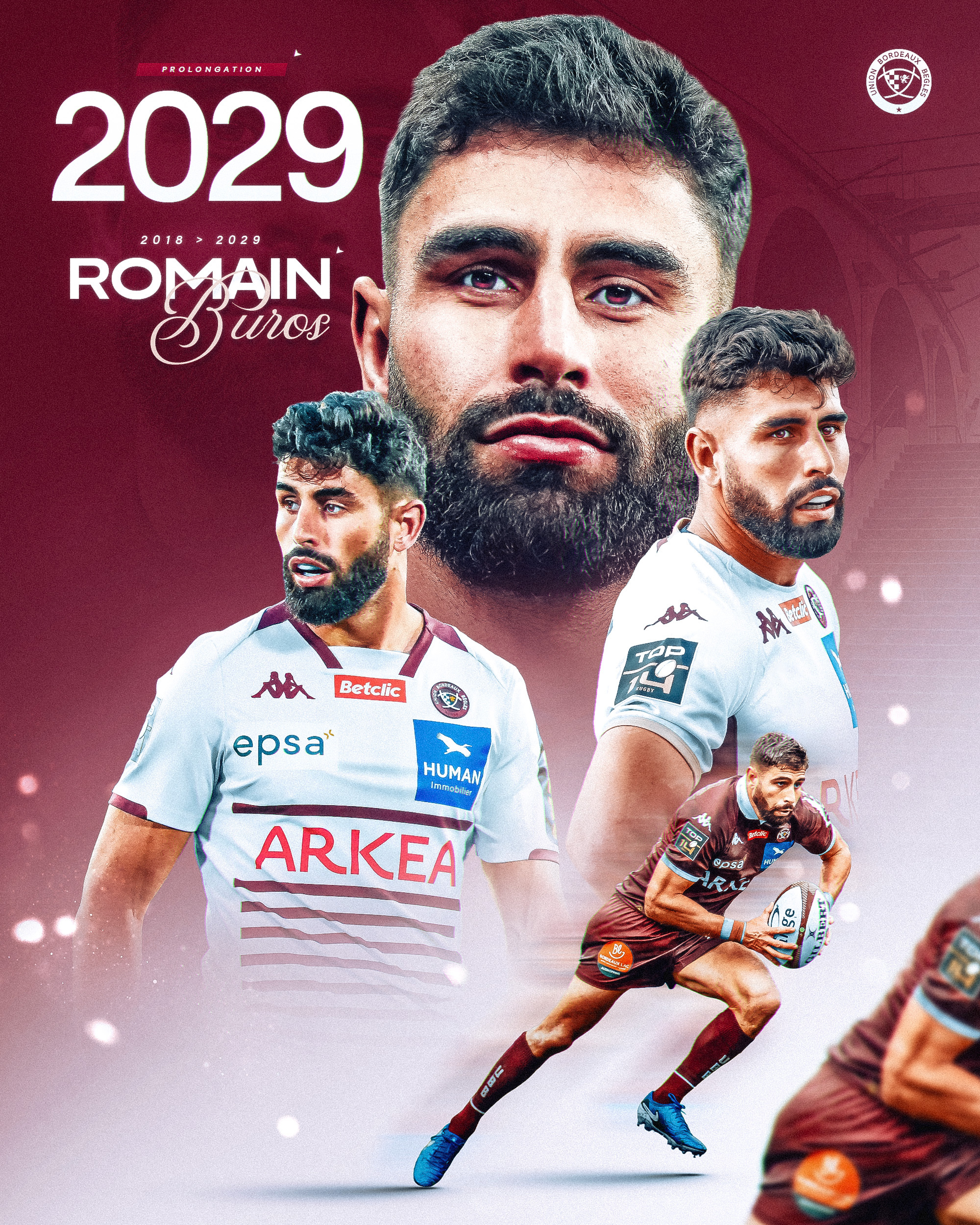 Arrivé au club en 2018 en provenance de la Section Paloise, Romain Buros joue pour la première fois sous le maillot bordelo-béglais lors de la 2ᵉ journée de la saison 2018-2019 face au Stade Français Paris.