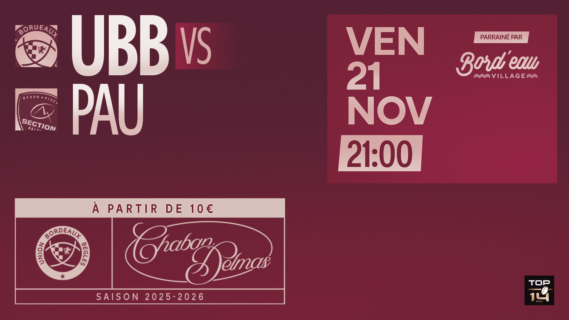 La LNR a dévoilé ce jour les dates et horaires des J12, J13 et J14 de Top 14. L'UBB recevra donc le RCT le samedi 20 décembre à 21h05, puis se déplacera à Clermont le samedi 27 décembre à 21h00 à l'occasion du Boxing Day. Enfin les girondins accueilleront le Racing 92 le samedi 3 janvier à 21h00 pour le premier match de 2026.
