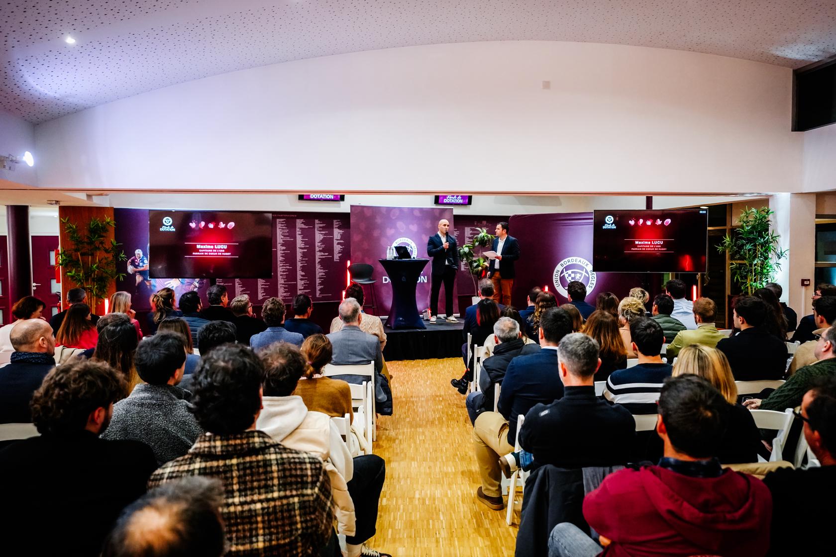 La soirée s’est ouverte par un mot de Laurent Marti, président de l’UBB, avant un échange avec Maxime Lucu, capitaine du club et parrain de Coeur de rugby, venu rappeler l’importance des valeurs de solidarité et de transmission portées par le rugby.