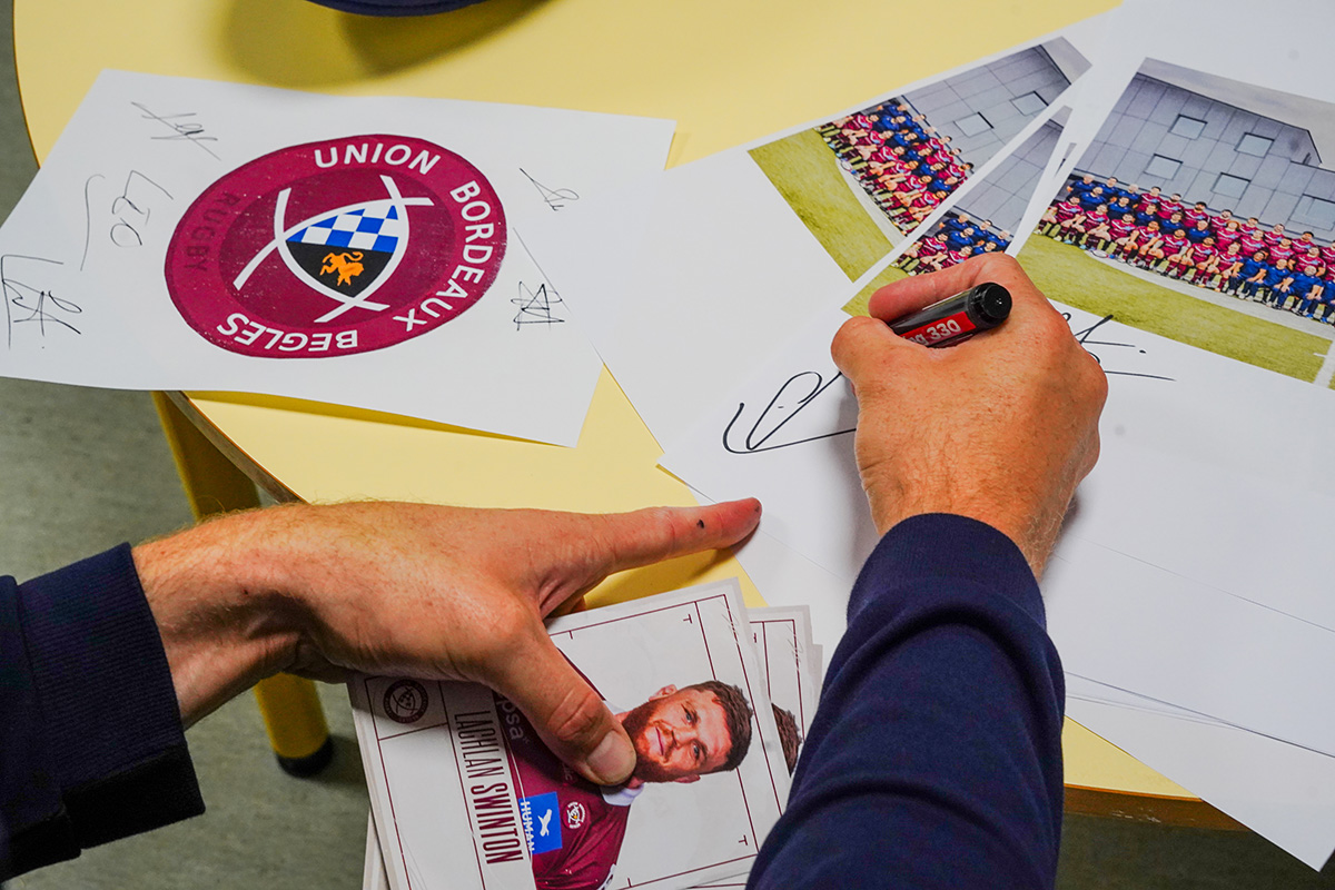 Dans le cadre du partenariat avec le CHU de Bordeaux, quatre joueurs — Sipili Falatea, Paul Abadie, Lachlan Swinton et Enzo Reybier, accompagnés de Léo — sont allés à la rencontre des jeunes de l'hôpital Jean Abadie pour partager un moment convivial.