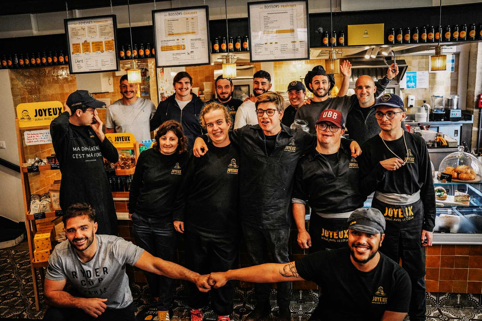 En janvier 2025, plusieurs joueurs de l’UBB se sont rendus au Café Joyeux de la rue Sainte Colombe pour partager un moment avec les employés. L’occasion pour eux de rencontrer leurs idoles et de valoriser la démarche d’inclusion que prône l’enseigne.