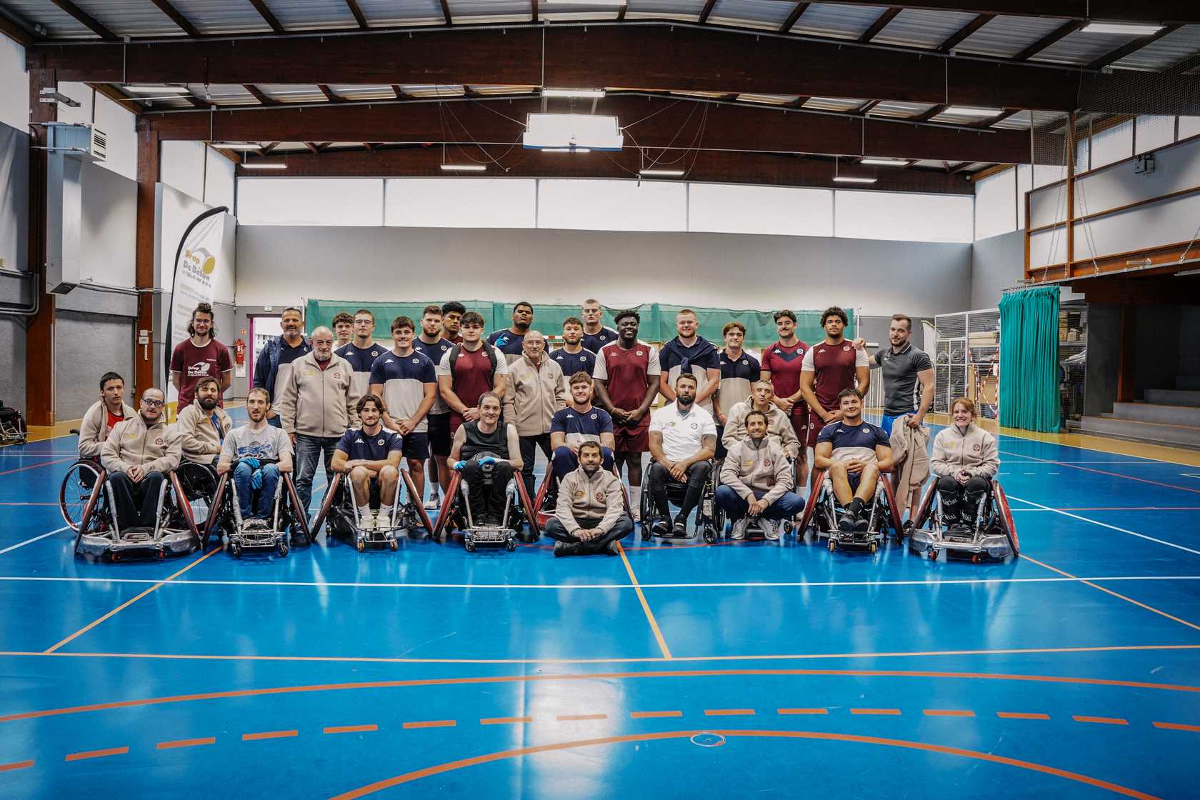 Les Espoirs de l'UBB avec les joueurs de l'équipe de rugby fauteuil UBB Drop de Béton