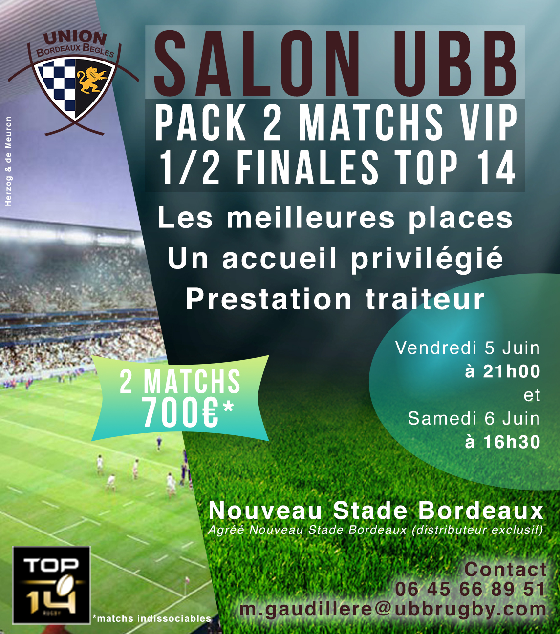 Pour réserver votre pack ou obtenir de plus amples informations, vous pouvez contacter Marilou au 06.45.66.89.51 ou par mail à l'adresse : m.gaudillere@ubbrugby.com