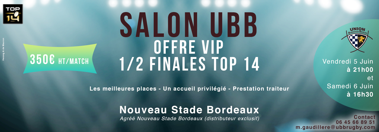 L'Union Bordeaux Bègles vous donne la possibilité d'assister aux deux demi-finales de manière privilégiée grâce à l'Offre VIP. Vous profiterez ainsi des meilleures places du stade, d'un accueil personnalisé et d'une prestation traiteur.