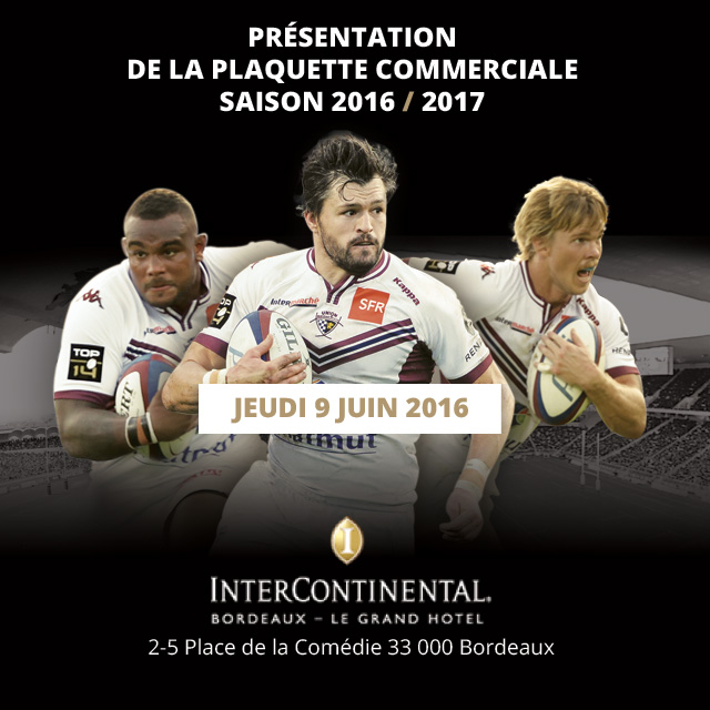 Vous êtes déjà une entreprise partenaire ou vous voulez le devenir ? Le Jeudi 9 Juin, l'Union Bordeaux Bègles vous invite à découvrir sa plaquette commerciale 2016-2017 à l'InterContinental Bordeaux - Le Grand Hôtel.