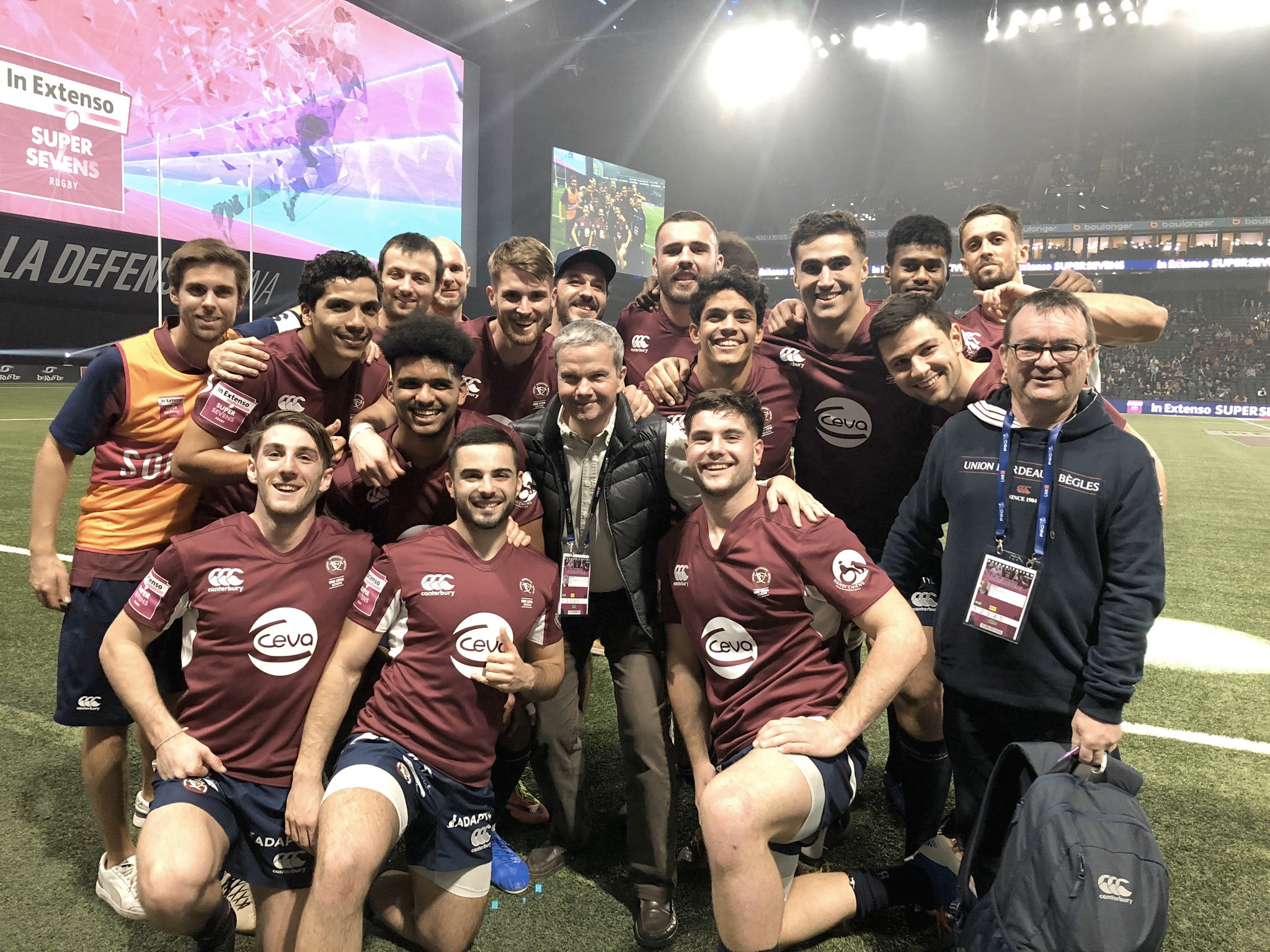 Marc Prikazsky entouré des joueurs de l'UBB Ceva Sevens en février 2020 lors de la première édition de l'In Extenso Supersevens, le tournoi de rugby à 7 organisé par la Ligue Nationale de Rugby.