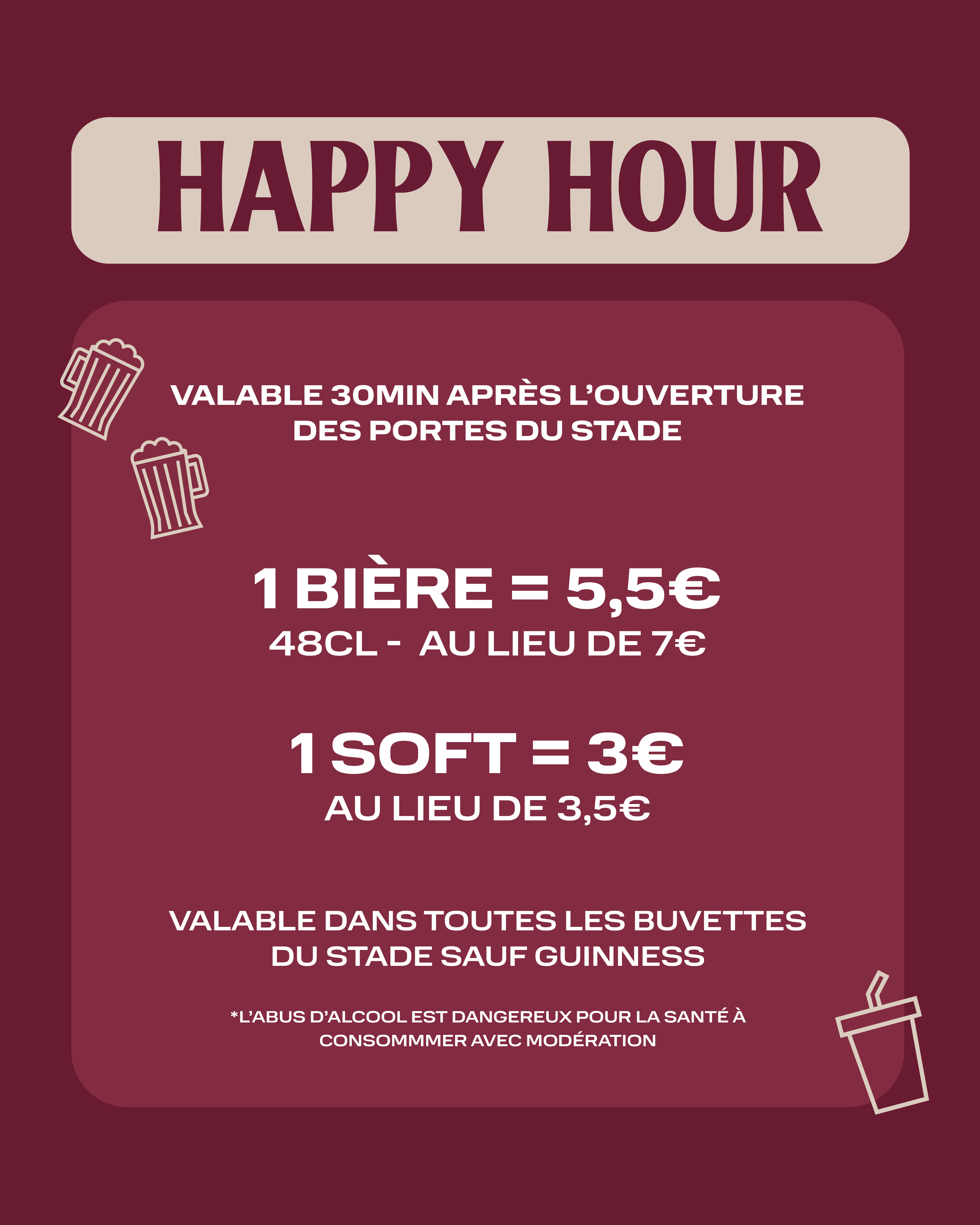 Pour vous désaltérer nos Corner Lillet Rosé et Carlsberg sont à votre disposition en plus des buvettes. Profitez également de notre Happy Hour durant les 30 premières minutes suivant l'ouverture des portes !